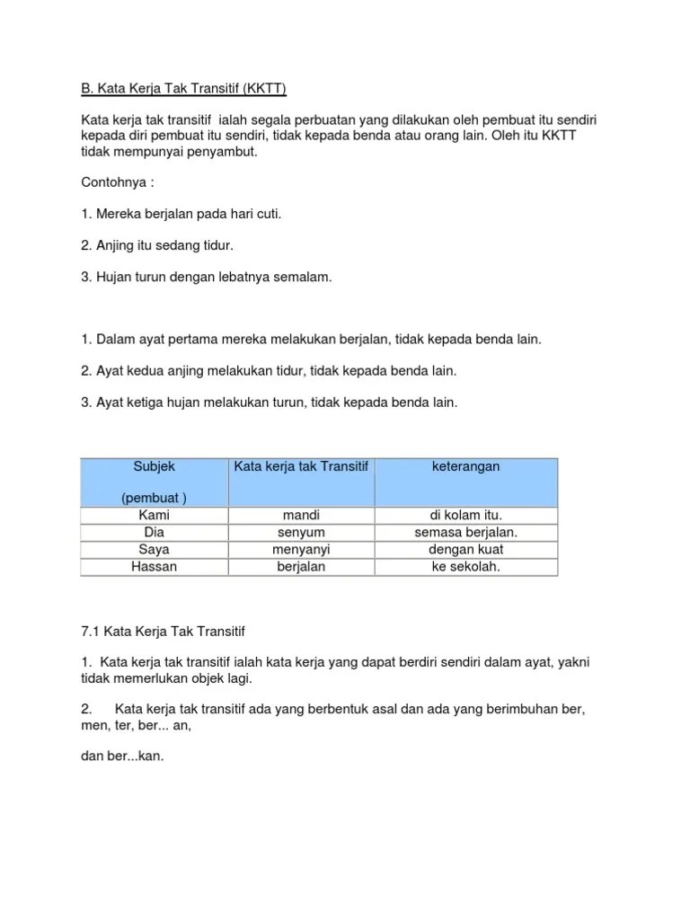 Sektor pengurusan akademik, jabatan pelajaran perak. Modul latih tubi tatabahasa : Kata kerja transitif & kata kerja tak transitif (tatabahasa spm kssm). Kata kerja tak transitif ialah segala perbuatan yang dilakukan oleh pembuat itu sendiri kepada . Kemudian, nyatakan sama ada kata kerja itu kata kerja transitif (kkt) atau kata .